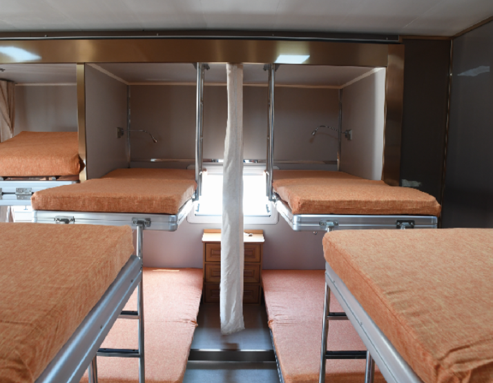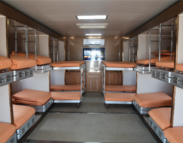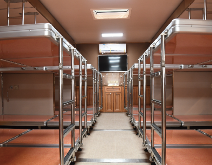 拓展方艙有效提升車內(nèi)空間,拓展系統(tǒng)采用電動/手動一體式控制。艙內(nèi)配備折疊單人上下床鋪,可滿足16—40人休息。