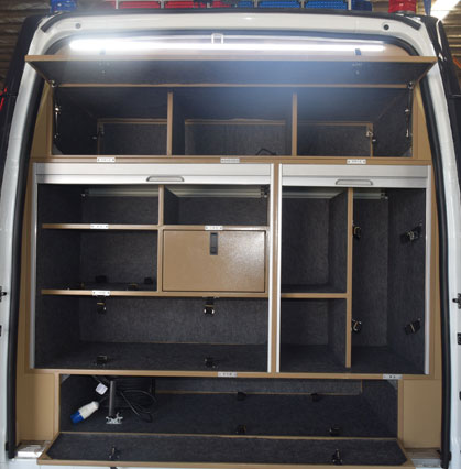 整車裝備柜集成存儲多種警用裝備等專業(yè)設(shè)施,使整車成為一個移動式機動作戰(zhàn)單元。