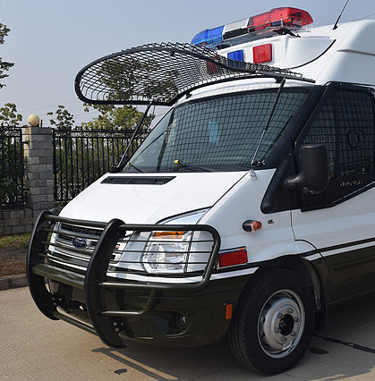 全車車窗配備鋼制高強(qiáng)度防護(hù)網(wǎng),前擋防護(hù)網(wǎng)能夠手動(dòng)掀開(kāi)和關(guān)閉,可選裝電動(dòng)開(kāi)合方式;車輛前后安裝保險(xiǎn)杠,具備一定沖撞能力,兩側(cè)裙邊加裝鋼制倒刺。
