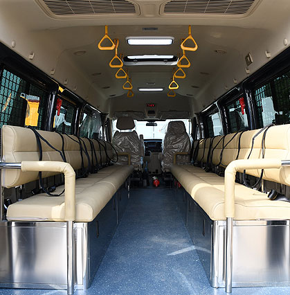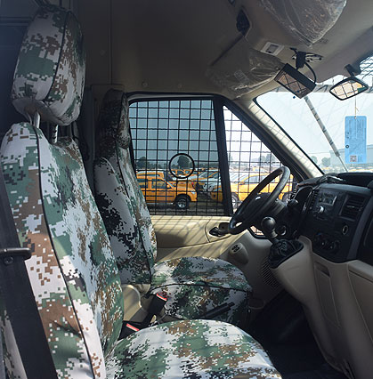 車內(nèi)兩側(cè)各設(shè)置一組鋼制長(zhǎng)條座柜,上部配備高密度汽車海綿沙發(fā),外包真皮面料,沙發(fā)套迷彩座椅布套,可拆卸更換,柜體通過(guò)掀開(kāi)坐墊可存放裝備。