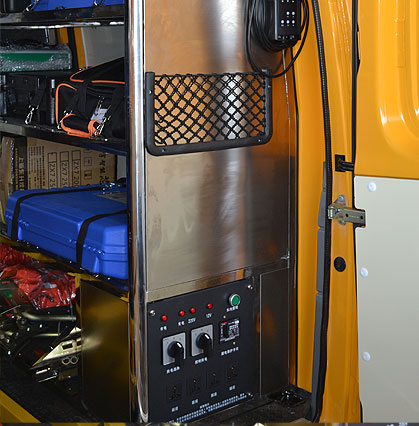 發(fā)電機優(yōu)質(zhì)環(huán)保、省油、低噪音,動力強勁,電壓穩(wěn)定;升降照明燈車載背俯式安裝結(jié)構(gòu),燈頭由旋轉(zhuǎn)云臺控制上下搜索定位照明;電控箱含琴鍵式面板,整車電路及溫濕度控制;外接電控制總成,整車溫濕度控制。
